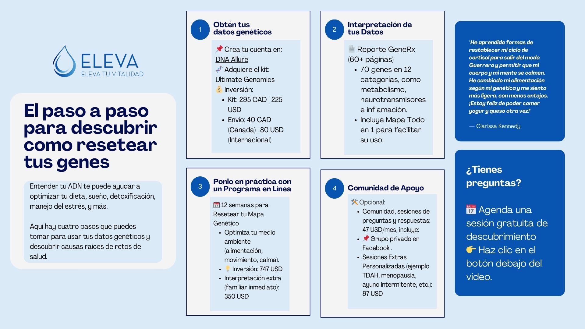 Tu inversión en el programa FUNDAMENTOS DE RESETEA TU MAPA GENÉTICO de 12 módulos PRE-GRABADO es de 747USD e incluye un reporte GeneRx y tu mapa Todo-en-1. Todas las sesiones se quedan grabadas, por lo que las puedes ver las veces que quieras a tu propio tiempo.